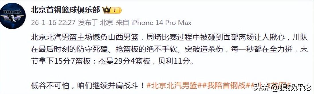 北京时间1月16日,CBA常规赛继续开打,北京84-90不敌山西,过去4场比赛,北京输了3场,而第四节崩盘引发外界的热议,大量的球迷冲到北京社媒评论区表达不满。北京官方社媒发文:北京北汽男篮主场憾负山西男篮,周琦比赛过程中被碰到面部离场让人揪心,川队在最后时刻的防守死磕、抢篮板的绝不手软、突破造杀伤,每一秒都在全力拼,末节拿下15分7篮板;杰曼29分4篮板...