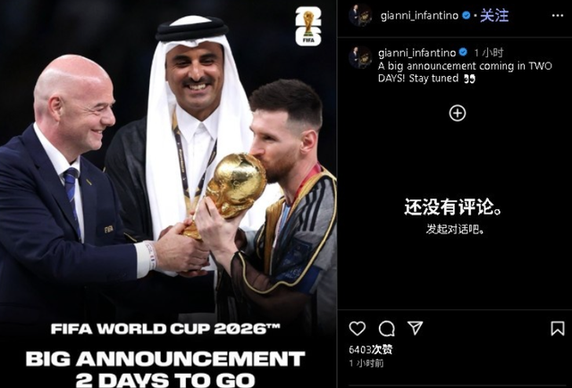 因凡蒂诺社媒:“两天后会有一个重大消息宣布,敬请期待。”俗话说,字数越少,事情越大。其实不难猜测,因凡蒂诺所谓的重大消息,应该是聘请梅西为2026年世界杯形象大使,考虑到梅西的地位以及最近的状态,这一决定可谓是实至名归、正当其时、十分必要。毫无疑问,如果马拉多纳是历史球王的话,而梅西则是现役球王。毕竟,八座金球奖杯这一成就既是前无古人,也很可能后无来者。